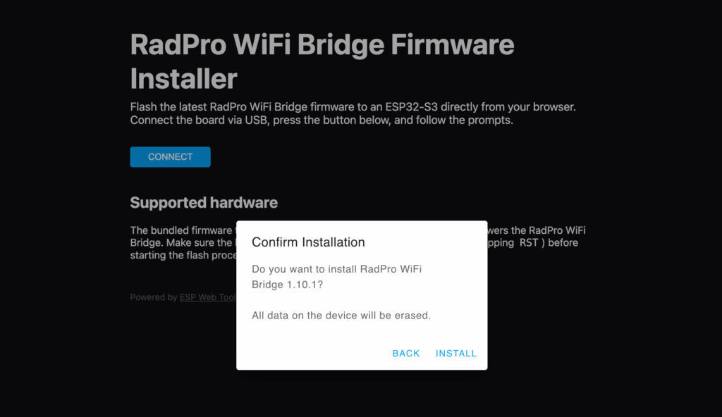 https://SunboX.github.io/radpro-wifi-bridge/web-install/ - Auf „Install“ klicken und im Dialog das passende serielles Device auswählen.